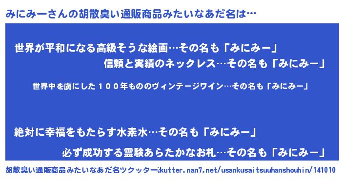 | 意味不明あだ名 | 『住所不定無職みにみー(12歳)』 |