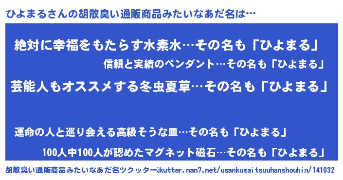 | 男性向けラノベタイトル風あだ名 | 『Re:ひよまるから始める異世界生活』 |