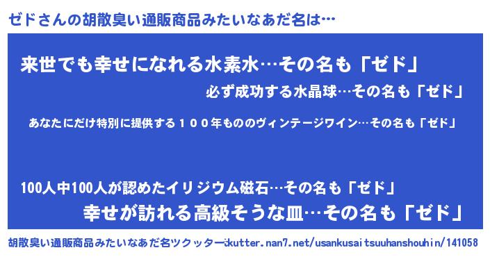 | 男性向けラノベタイトル風あだ名 | 『この素晴らしい世界にゼドを!』 |