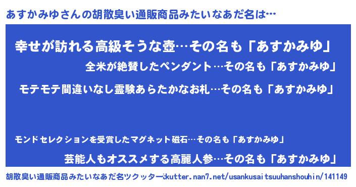 | 意味不明あだ名 | 『ペロリンあすかみゆ』『自称あすかみゆ』 |