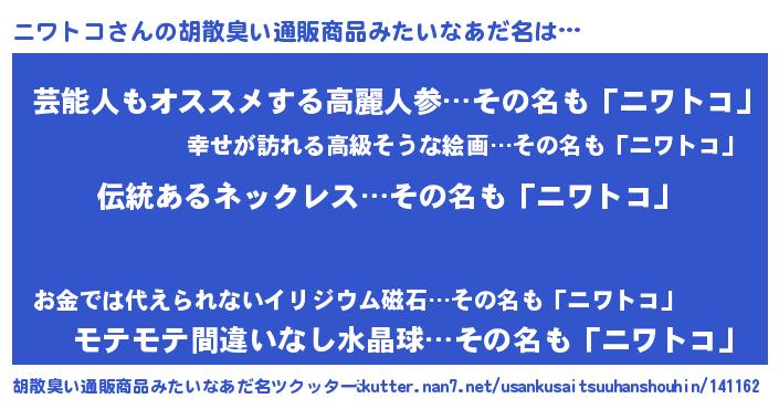 | ヘコむあだ名 | 『ニワっ子』『ニワにー』『なまこ酢』 |
