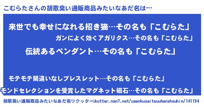 | 意味不明あだ名 | 『なめこ科こむらた属』『自称こむらた』 |