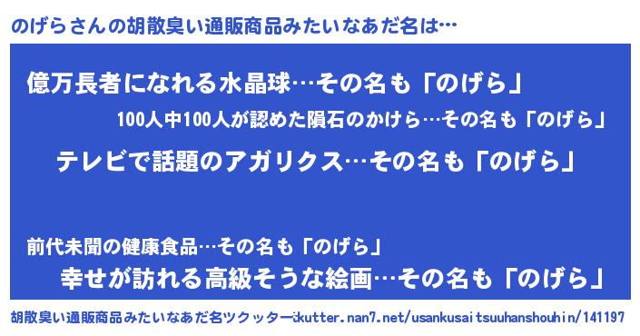 | 男性向けラノベタイトル風あだ名 | 『のげらに滅ぼされるだけの簡単なお仕事です』 |