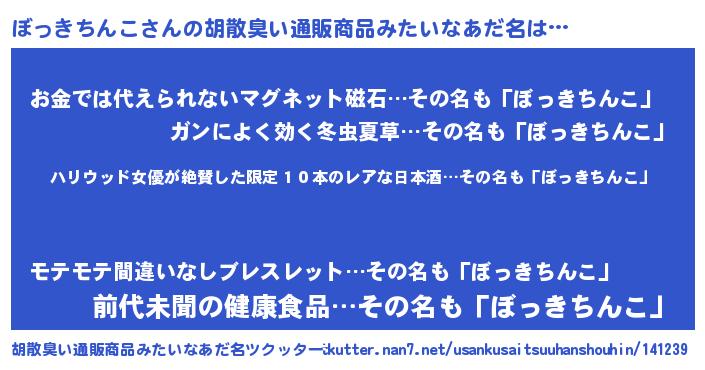 | 意味不明あだ名 | 『住所不定無職ぼっきちんこ(39歳)』 |