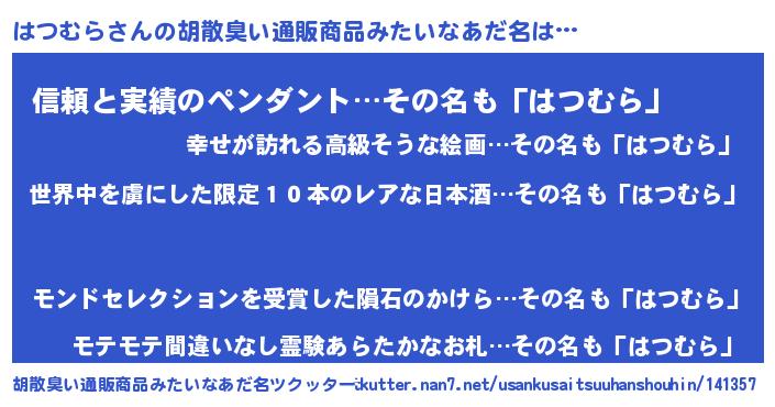 | 男性向けラノベタイトル風あだ名 | 『魔弾の王とはつむら』『はつむらの憂鬱』 |
