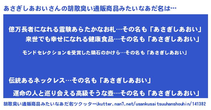 | 男性向けラノベタイトル風あだ名 | 『あさぎしあおい~年齢イコール彼女いない歴の魔法使い~』 |