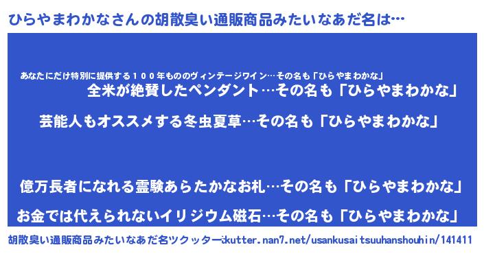 | 男性向けラノベタイトル風あだ名 | 『ひらやまわかなに滅ぼされるだけの簡単なお仕事です』 |