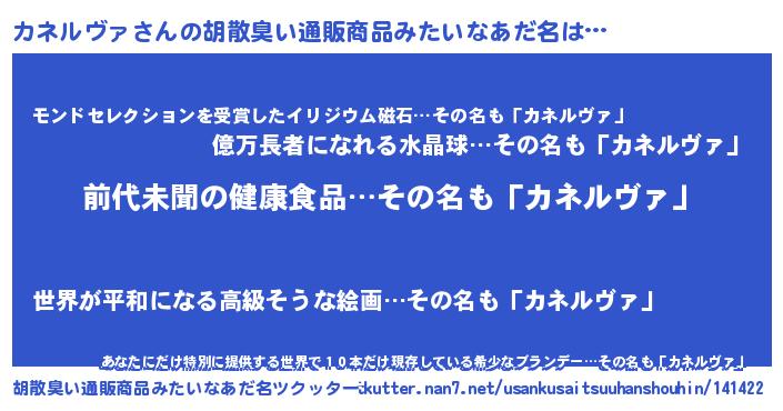 | 男性向けラノベタイトル風あだ名 | 『うちのカネルヴァが世界を掌握している!』 |