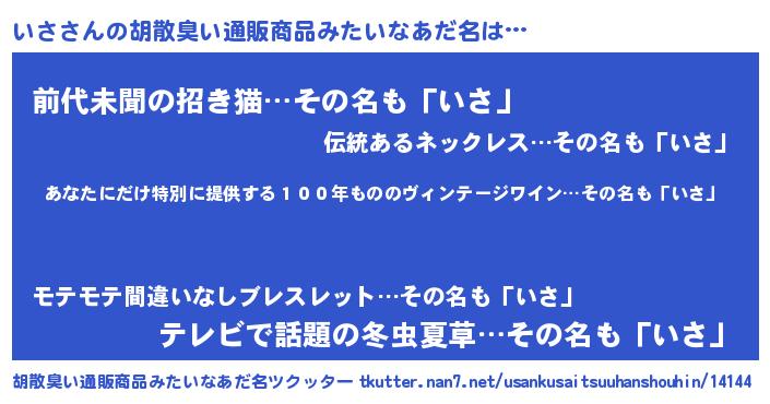 | 意味不明あだ名 | 『住所不定無職いさ(1歳)』『永久保存いさ』 |