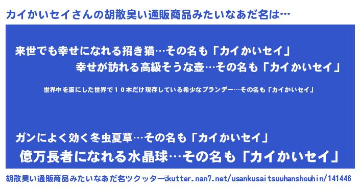 | ヘコむあだ名 | 『カイかいセイ(遠い目)』『カイふぇ~』 |