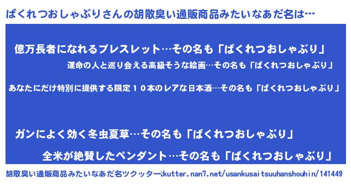 | 意味不明あだ名 | 『住所不定無職ばくれつおしゃぶり(65歳)』 |