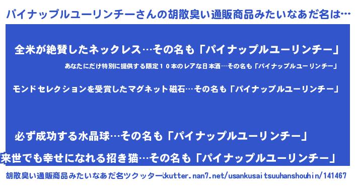 | 男性向けラノベタイトル風あだ名 | 『うちのパイナップルユーリンチーが世界を掌握している!』 |