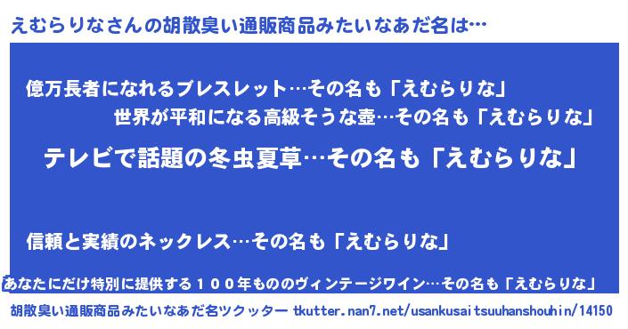 | 男性向けラノベタイトル風あだ名 | 『Re:えむらりなから始める異世界生活』 |