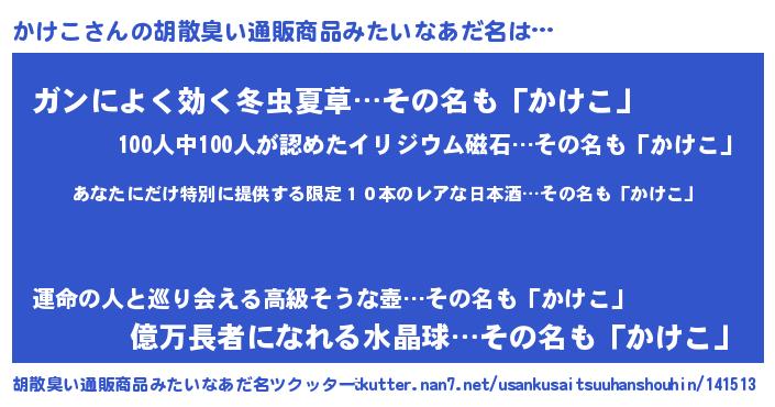 | 男性向けラノベタイトル風あだ名 | 『この素晴らしい世界にかけこを!』 |