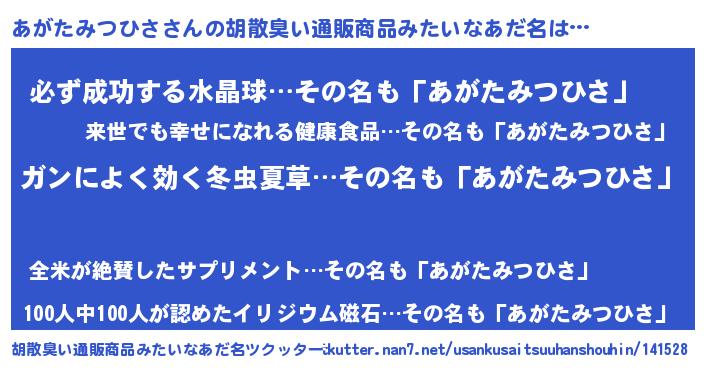 | ヘコむあだ名 | 『あがもー』『あがたみつひさ(笑)』 |
