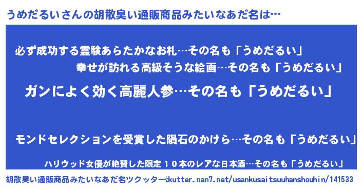 | ヒーロー風カッコイイあだ名 | 『超時空戦士ウメダルイ』『仮面ウメダー』 |