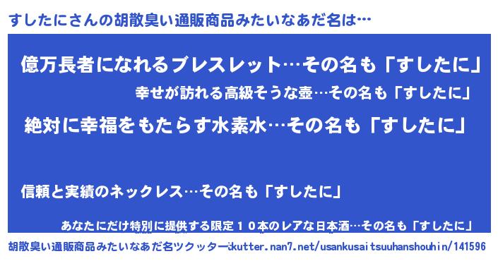 | 男性向けラノベタイトル風あだ名 | 『すしたにという概念が存在しない退屈な世界 』 |