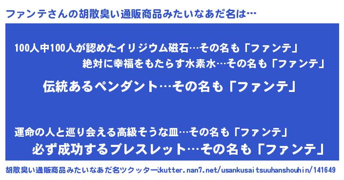 | 男性向けラノベタイトル風あだ名 | 『ファンテの嫁は女の子じゃないと思った?』 |