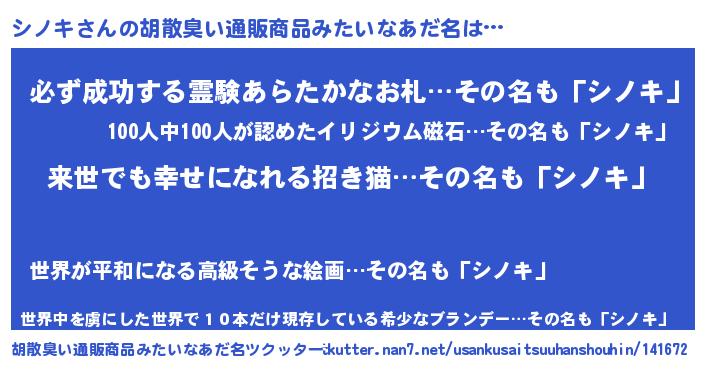 | 男性向けラノベタイトル風あだ名 | 『シノキという概念が存在しない退屈な世界 』 |