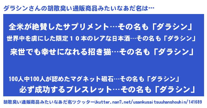 | 男性向けラノベタイトル風あだ名 | 『ダラシンという概念が存在しない退屈な世界 』 |