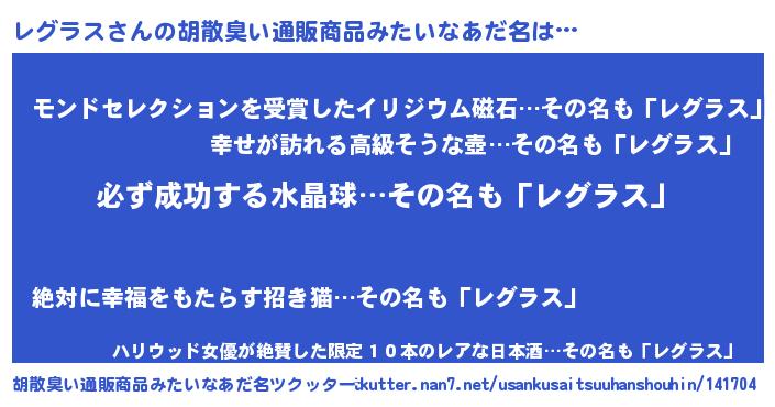 | 男性向けラノベタイトル風あだ名 | 『レグラスの憂鬱』『レグラススレイヤー』 |