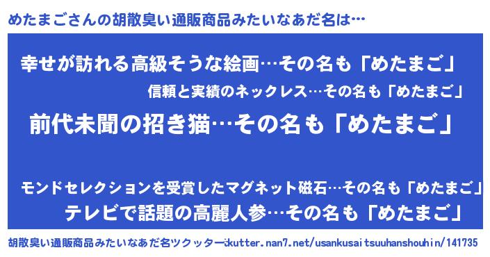 | 男性向けラノベタイトル風あだ名 | 『めたまご~年齢イコール彼女いない歴の魔法使い~』 |