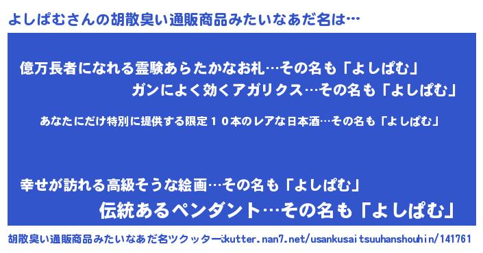 | 男性向けラノベタイトル風あだ名 | 『この素晴らしい世界によしぱむを!』 |