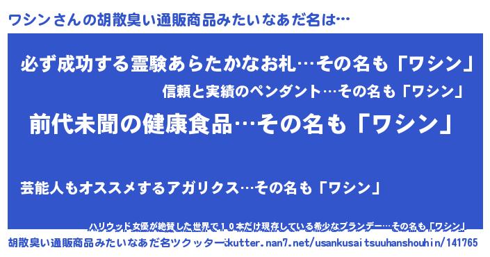 | 男性向けラノベタイトル風あだ名 | 『ワシンに滅ぼされるだけの簡単なお仕事です』 |