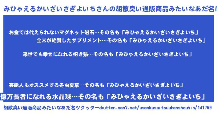 | ヘコむあだ名 | 『みひゃえるかいざいさぎよいち(笑)』 |