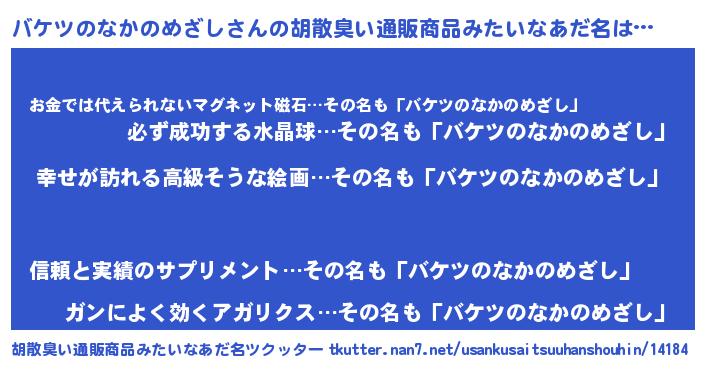| ファンタジー風あだ名 | 『エターナルバケツノナカノメザシー』 |