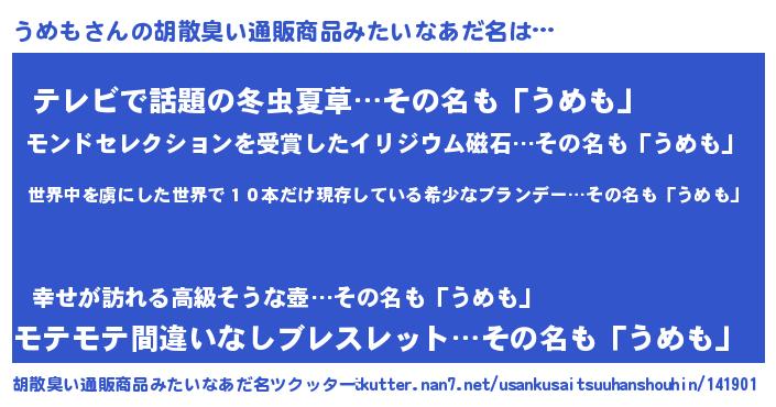 | 意味不明あだ名 | 『住所不定無職うめも(85歳)』『自称うめも』 |