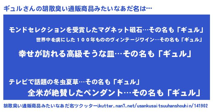 | 女子向けラノベタイトル風あだ名 | 『ギュルの雑貨屋さん』『ギュル恋絵巻』 |