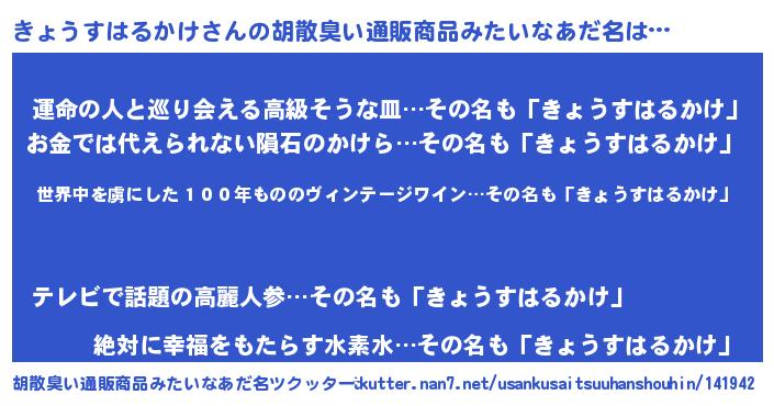 | 男性向けラノベタイトル風あだ名 | 『きょうすはるかけに滅ぼされるだけの簡単なお仕事です』 |