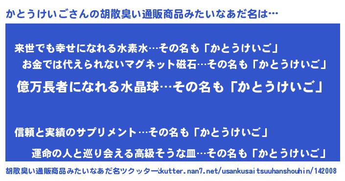 | ヘコむあだ名 | 『かとにゅー』『かとうけいご(震え声)』 |