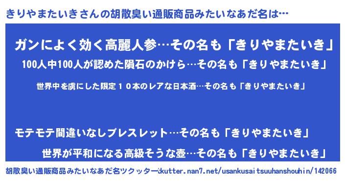 | 男性向けラノベタイトル風あだ名 | 『この素晴らしい世界にきりやまたいきを!』 |
