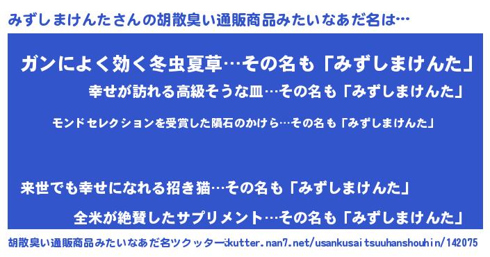 | 男性向けラノベタイトル風あだ名 | 『みずしまけんたに滅ぼされるだけの簡単なお仕事です』 |