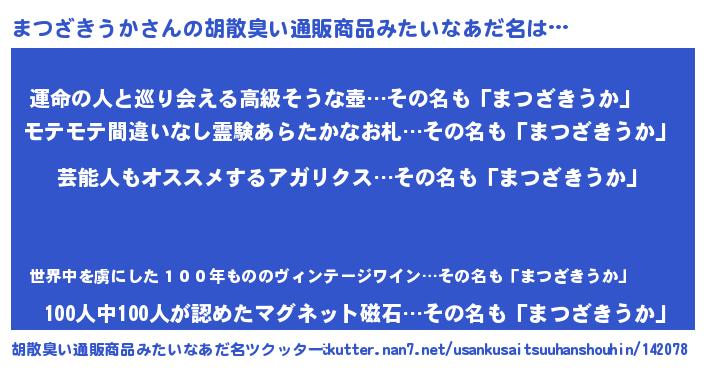 | 男性向けラノベタイトル風あだ名 | 『Re:まつざきうかから始める異世界生活』 |