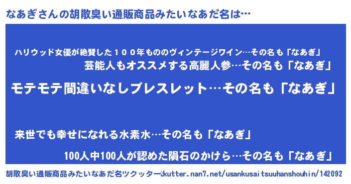 | 男性向けラノベタイトル風あだ名 | 『なあぎの憂鬱』『魔弾の王となあぎ』 |