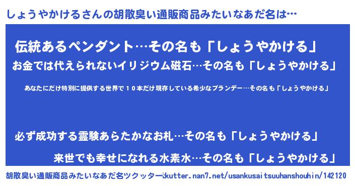 | 意味不明あだ名 | 『住所不定無職しょうやかける(84歳)』 |