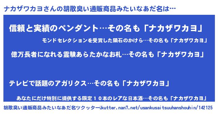 | 男性向けラノベタイトル風あだ名 | 『うちのナカザワカヨが世界を掌握している!』 |