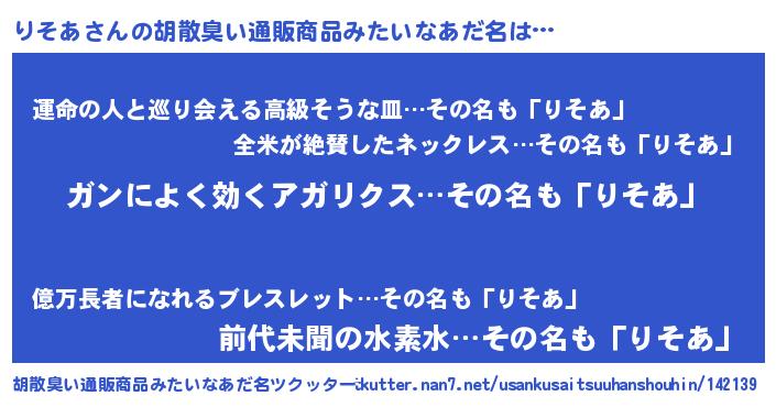 | ヘコむあだ名 | 『牛乳』『りそあ(笑)』『りそぷりん』 |