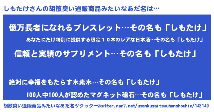 | 意味不明あだ名 | 『とにかく怪しいしもたけ』 |