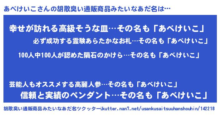 | 意味不明あだ名 | 『眠気覚ましガムあべけいこ味』 |