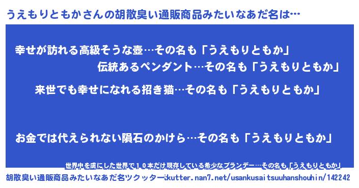 | ヘコむあだ名 | 『うえもりともか(笑)』『牛乳』 |