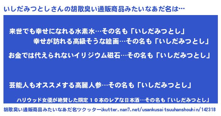 | ヘコむあだ名 | 『いしだみつとし(爆)』『なまこ酢』 |