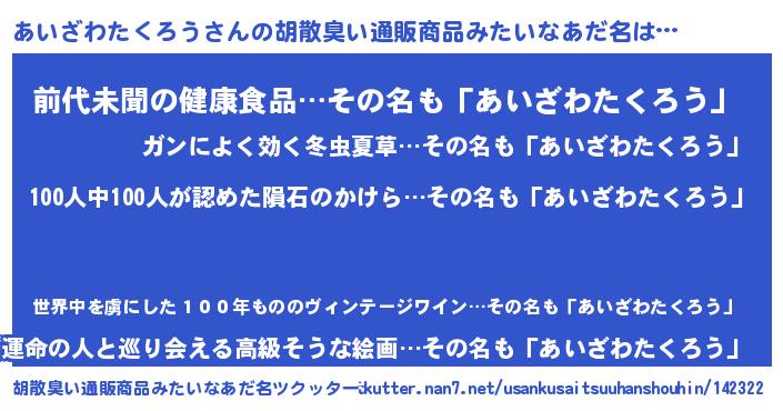 | ヘコむあだ名 | 『あいざわたくろう(苦笑)』『酢こんぶ』 |