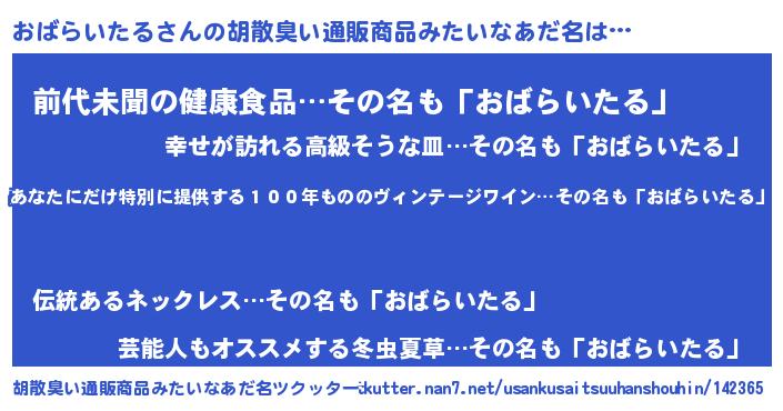 | 男性向けラノベタイトル風あだ名 | 『この素晴らしい世界におばらいたるを!』 |