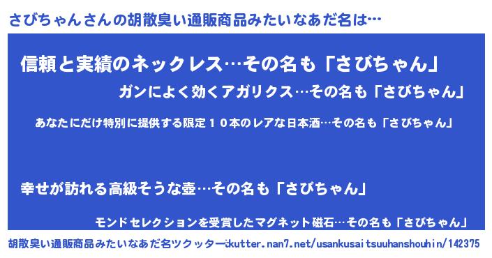 | 男性向けラノベタイトル風あだ名 | 『この素晴らしい世界にさびちゃんを!』 |