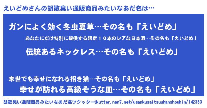 | 男性向けラノベタイトル風あだ名 | 『えいどめに滅ぼされるだけの簡単なお仕事です』 |