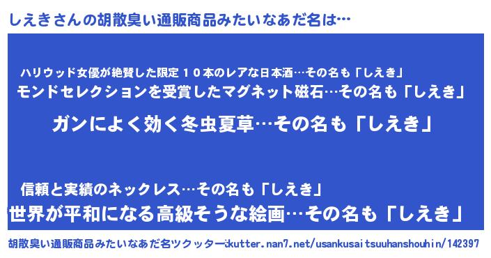 | 意味不明あだ名 | 『自称しえき』『住所不定無職しえき(89歳)』 |
